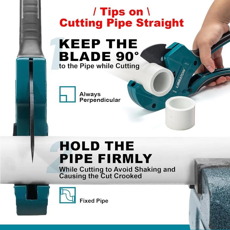 „ÄêTips on Cutting Pipes Straight„Äë Please make sure that the pipe is perpendicular to the blade before cutting, as it helps to ensure cut the pipe straight.