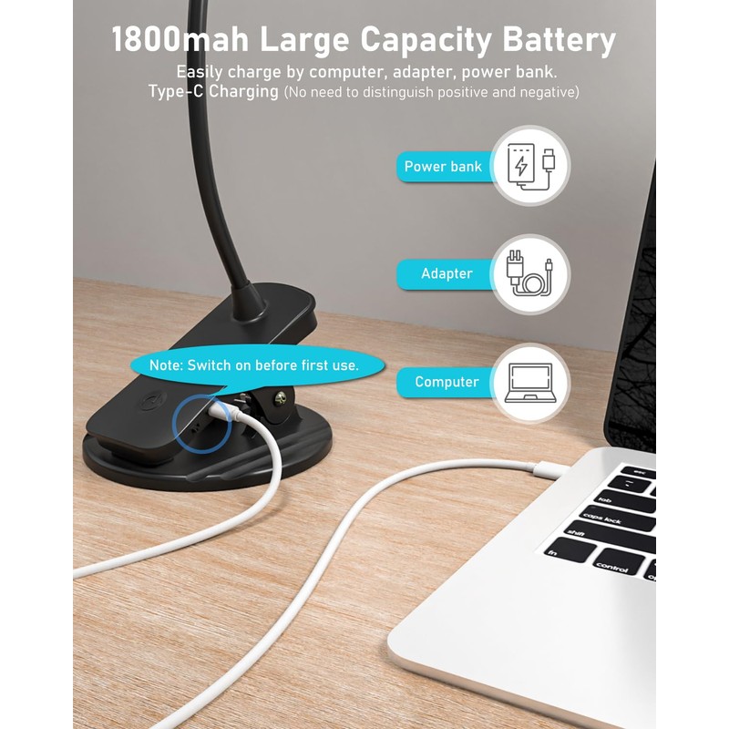 - Hohe Kapazit?t & Wiederaufladbar Klemmlampe akku USB kann aufgeladen werden. Der eingebaute 1800-mAh-Akku bietet kontinuierliche Beleuchtung ber l?ngere Zeitr?ume hinweg (geringe Helligkeit). Schnell aufladbare Tybe C-Schnittstelle (ausgestattet mit einem 0.8 m langen USB-Datenkabel), Sie mssen die Richtung nicht unterscheiden, nur 4 Stunden, Sie k?nnen jederzeit und berall lesen, wodurch die Probleme beim Anschlie?en von Kabeln entfallen.