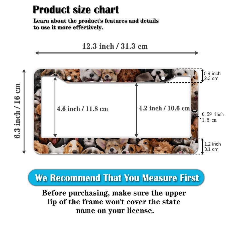 - STANDARD FRAME SIZE: Ensure a perfect fit by checking the dimensions to avoid covering your state name. These frames are specifically designed to fit standard American license plates measuring approximately 12.3" x 6.3" (16 x 31 cm). for most license plates in the U.S.
