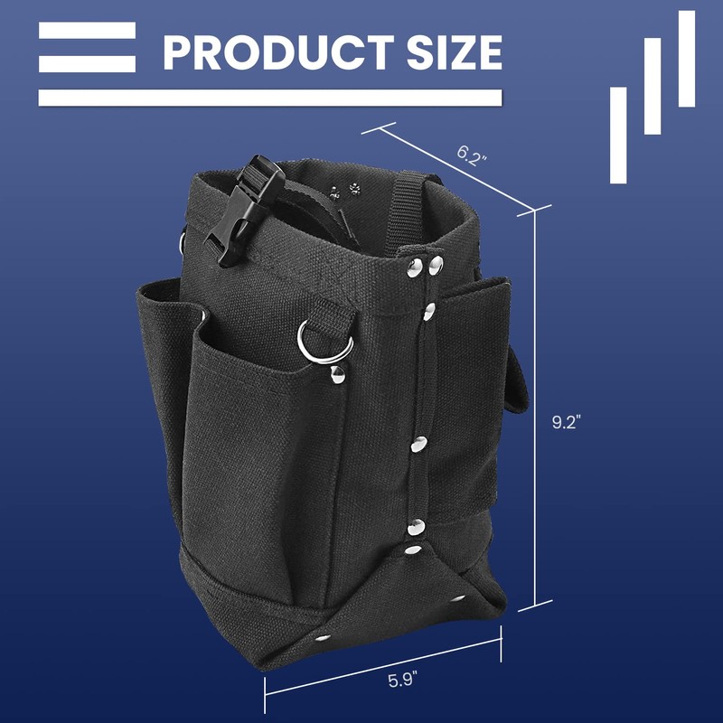 - Professional construction tool bag for collecting spud tools and bolts, contains one large main pocket, 2 small front and inside pockets, 2 side tool holders, 2 D-rings and 27 corrosion resistant rivets. Measures 6.2" x 5.9" x 9.2".