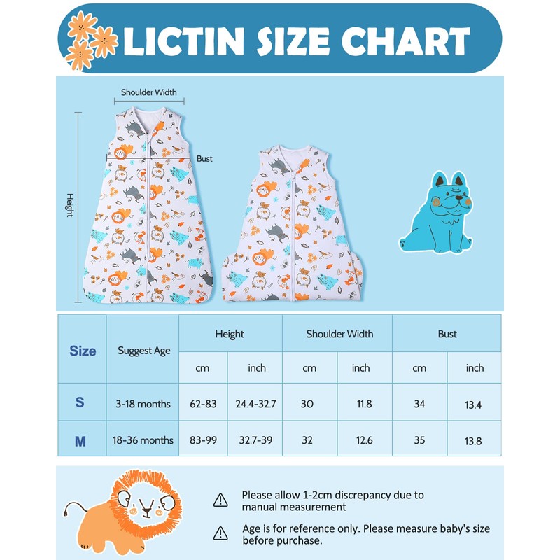- Size Available: With our exclusive fastening tapes, you can easily adjust the length of Lictin sleep suit to meet baby’s growth needs, which ranges from 62 to 83cm/3-18 months for small size; 83 to 99cm/18 to 36 months for medium size. Note: Age is for reference only. Please measure baby’s size before purchase.