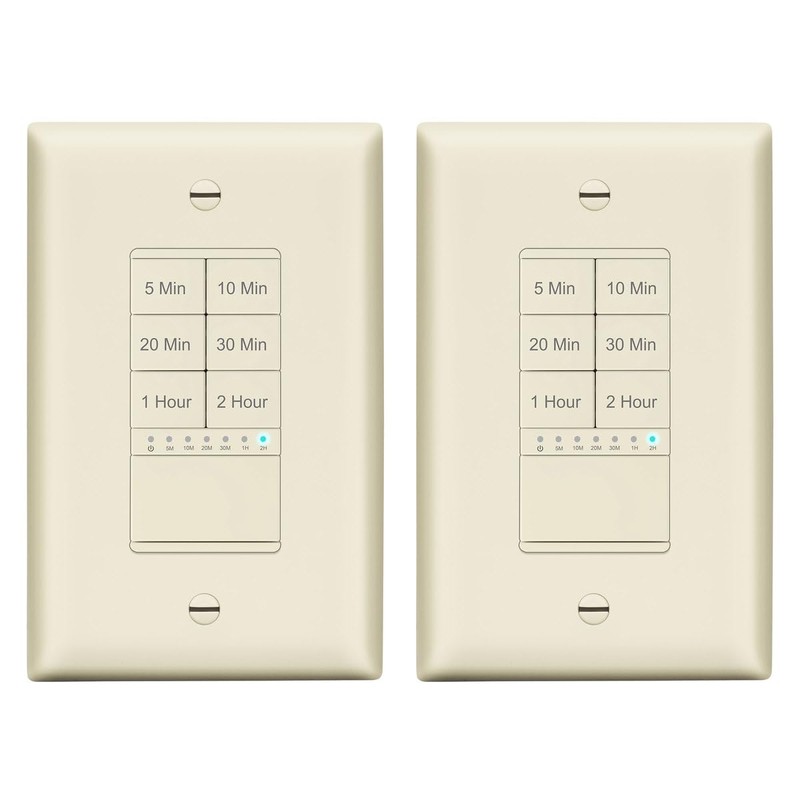 LIDER 2-Hour Countdown Timer Switch with Wall Plate, 5-10-20-30 Min, 1-2 Hour, for Lighting or Fans, LED Indicator, 1200W, Neutral Wire Required, LTS-2H-LAWP2P, Light Almond, 2-Pack