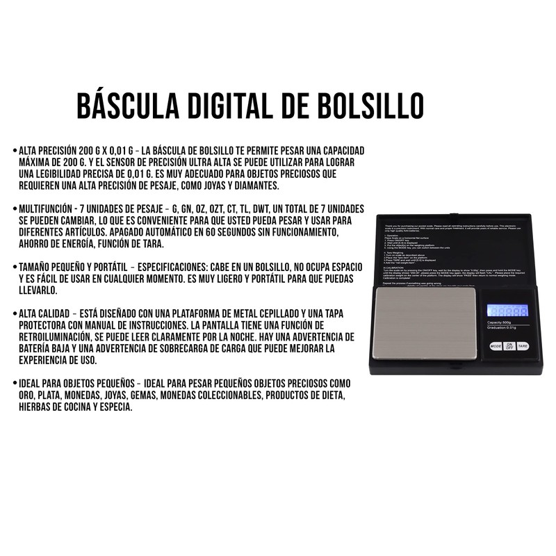 - Alta Precisión 200 g x 0,01 g - la báscula de bolsillo te permite pesar una capacidad máxima de 200 g. Y el sensor de precisión ultra alta se puede utilizar para lograr una legibilidad precisa de 0,01 g. Es muy adecuado para objetos preciosos que requieren una alta precisión de pesaje, como joyas y diamantes.