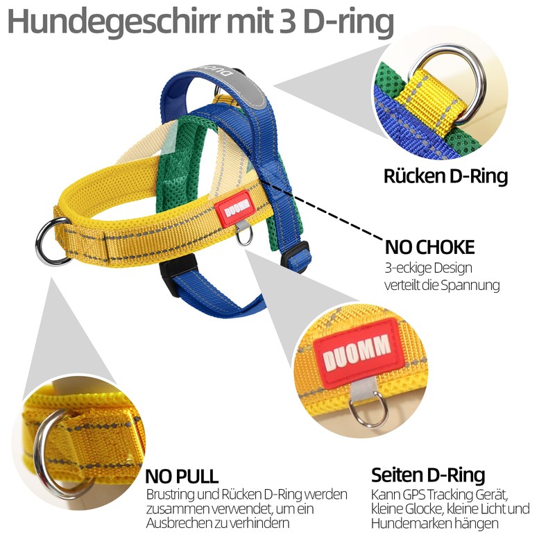 - 3 D-ring design: This dog harness has 3 D-rings (front, back and side). Use the back and chest rings together to prevent complete escape. The side rings on the dog harness are used to attach a tracking device or lamp for quick location