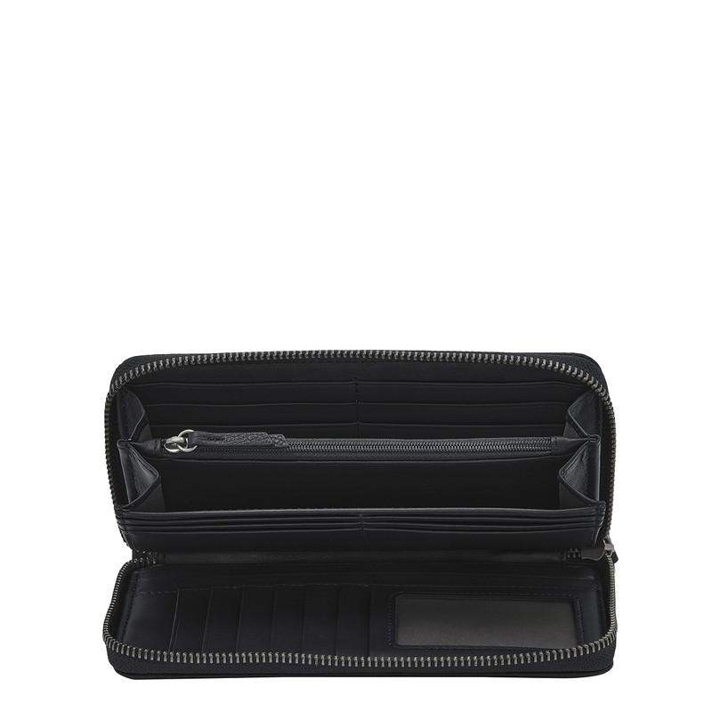 - Large wallet / soft, grained smooth leather / main compartment with all-round zip / interior with numerous note and card slots as well as a coin pocket with zip / integrated RFID protection / logo embossed front.