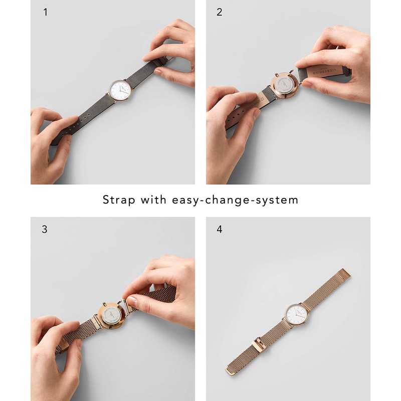 • High-quality genuine leather strap with stainless steel pin buckle. The easy-change system with interchangeable spring bars makes it easy to change the strap.