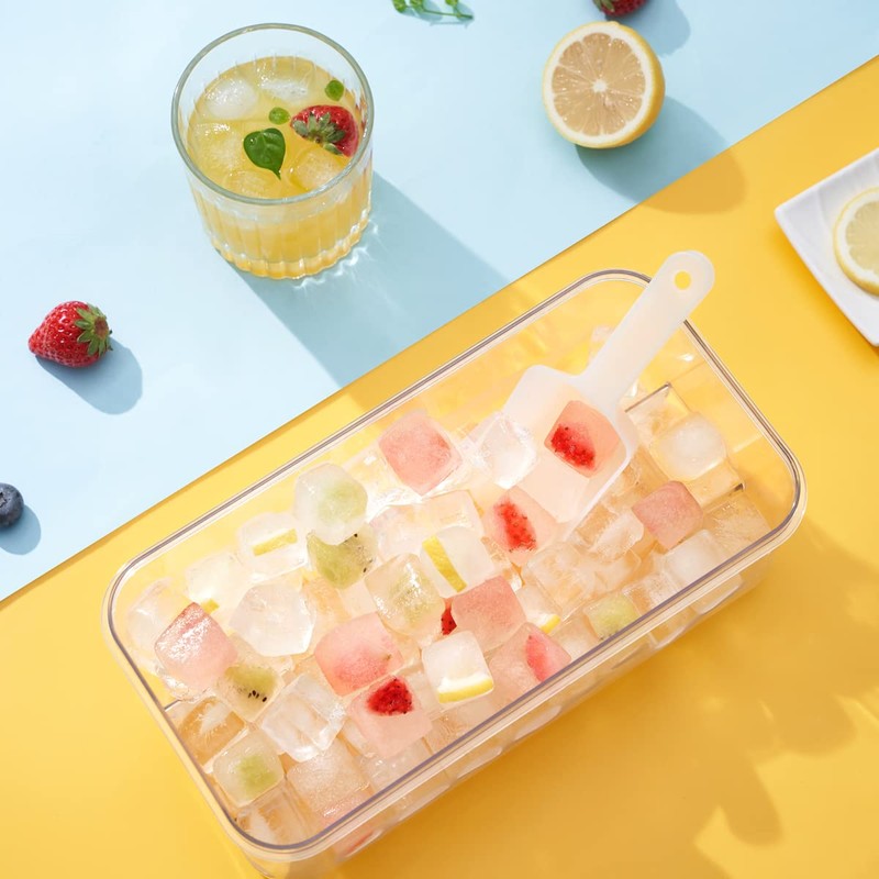 PACKAGE: 1 pc ABS airtight locking lid, 1 pc PP nail plate, 1 pc or 2 pcs silicone ice cube trays, 1 pc PET ice cube container.