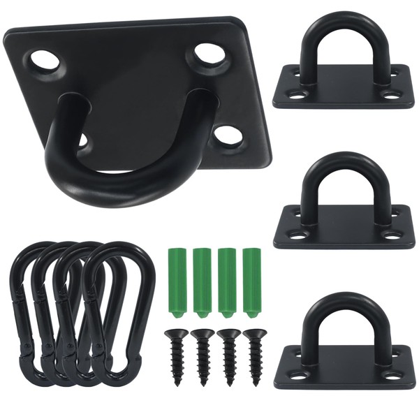 LifCratms 4 PCS Black Square Stainless Steel Ceiling Hooks Heavy Duty Pad Eye Plates + 4 Snap Hooks, with Plastic Expansion Tubes and Screws - Indoor/Outdoor