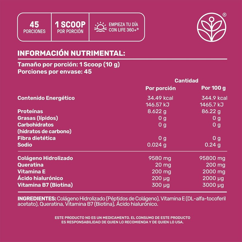 - COMPOSICIÓN: LIFE 360+ Collagen Blend contiene péptidos de colágeno hidrolizado, queratina, ácido hialurónico, vitamina E y vitamina B7 (biotina) una fórmula para su rutina.