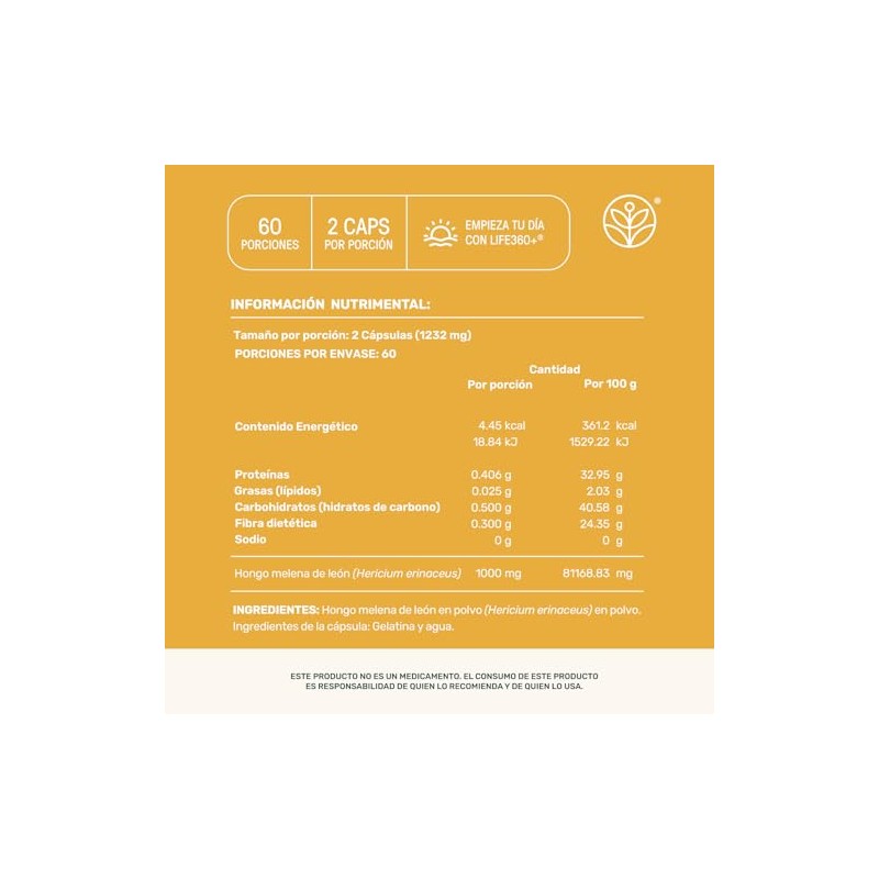 - FÓRMULA A BASE DE HONGO MELENA DE LEON: Cada cápsula contiene hongo melena de león (Hericium erinaceus) en polvo. No exceda la porción de 2 cápsulas por dia.