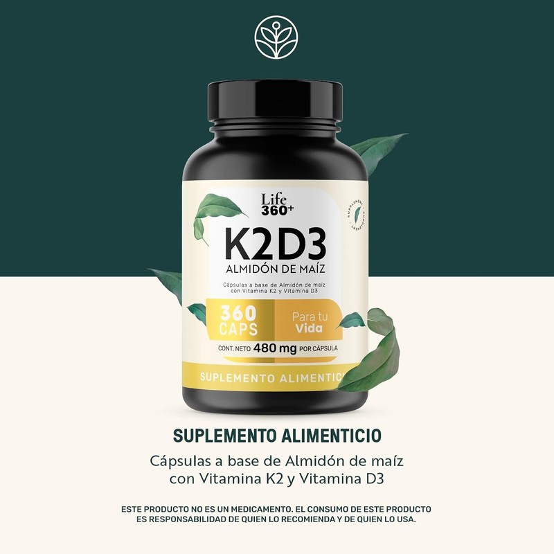 - PRESENTACIÓN: LIFE360+ K2D3 es un suplemento alimenticio en cápsulas a base de almidón de maíz con vitamina K2 y vitamina D3 que se encuentra disponible en presentación de envase de tarro de plástico con un contenido neto de 360 cápsulas