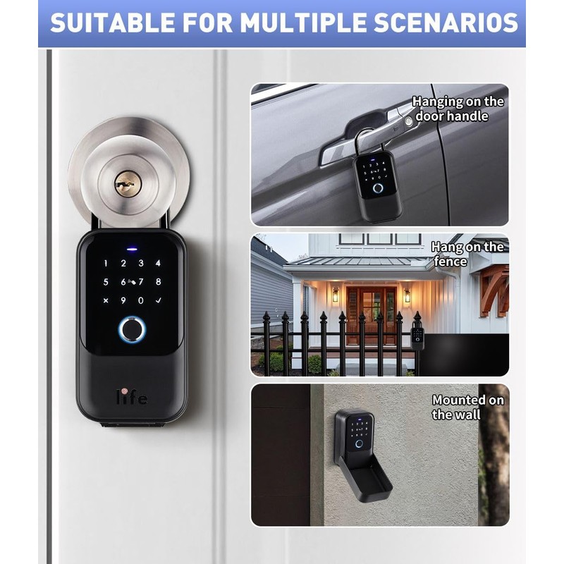 LIFE 5 in 1 innovative smart keyless padlock featuring smart home apps compatibility, strong alluminium alloy materials and waterproof design. Suitable for wall mount or shackle usage. Perfect for outdoor gates, storage units, or any application requiring secure access control. An ideal choice for both residential and commercial security needs.
