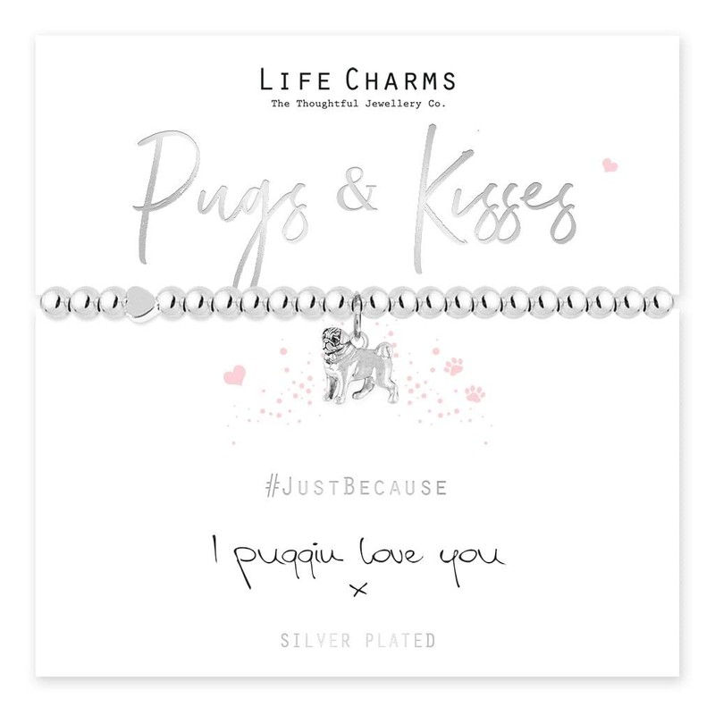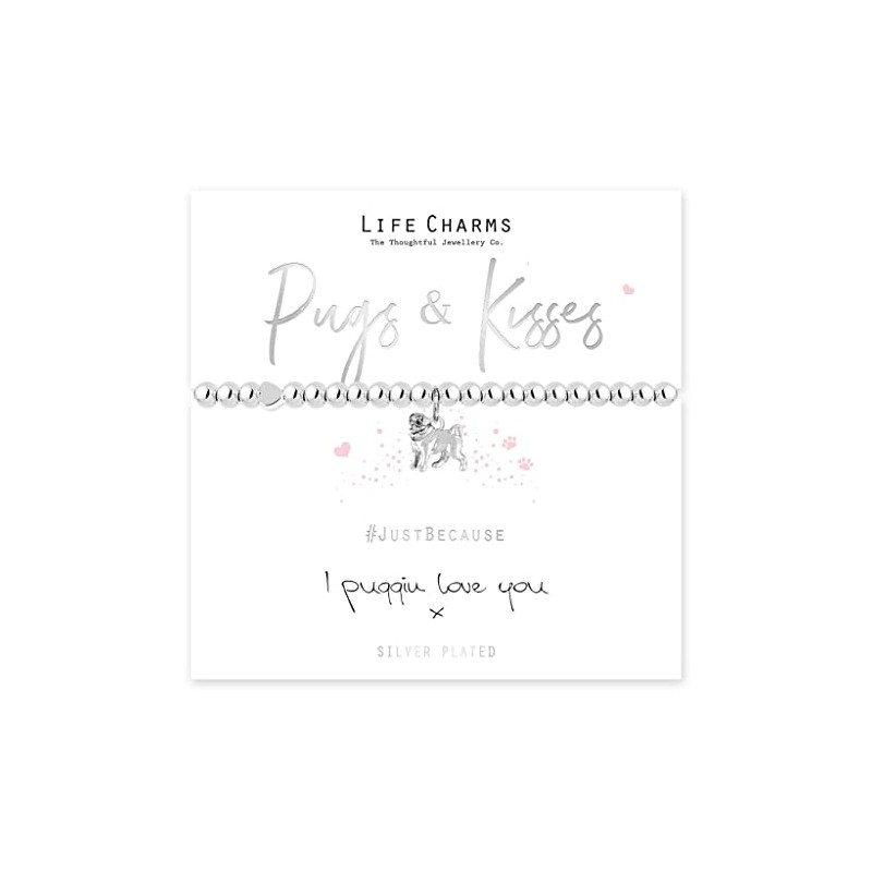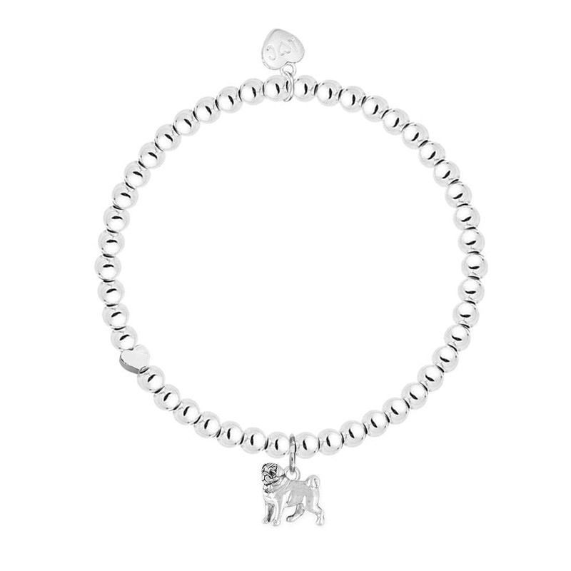 Pure silver plated pug charm presented on a 5 mm beaded stretch bracelet. The bracelet comes presented in a luxury gift box with a Just Because 'I Puggin Love You' card. All jewellery is finished to the highest standard & E-coated to prevent any tarnishing.