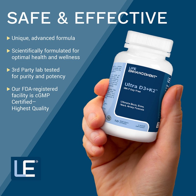 Our Vitamin D3 and K2 supplements are manufactured following strict standards in our FDA-registered facility. We use components like rice flour and gelatin capsules that comply with Current Good Manufacturing Practices (CGMP).