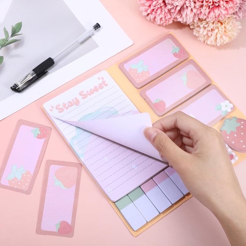 • Strawberry Sticky Notes: The berry self-stick notepads feature a cute strawberry theme with colorful sticky notes in pink, red, and green. This cute writing memo pads set adds a lively touch to your workspace or study area