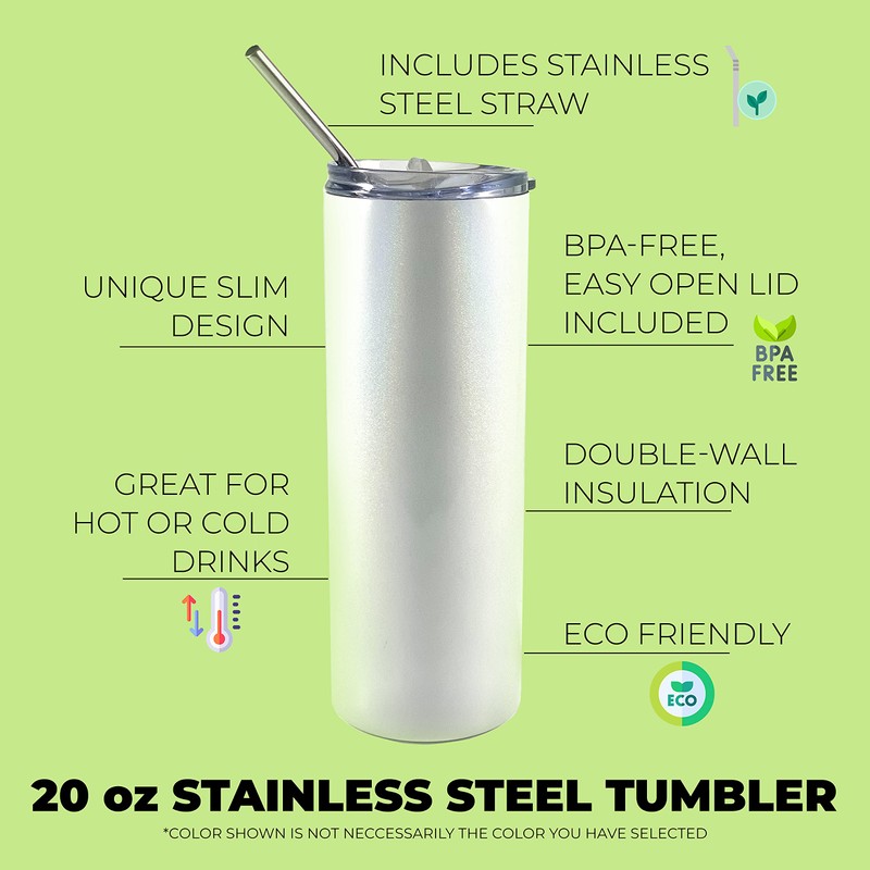 The 20 oz Stainless Steel Travel Tumbler is an innovative drinkware that is suitable for beverages both hot and cold. This slim tumbler uses double wall vacuum insulated technology for temperature preservation, keeping hot beverages warm for up to 6 hours and cold drinks chilled for up to 18 hours. The tumbler is BPA free and made with high quality food grade stainless steel to make clean up a breeze. Each tumbler includes a stainless-steel straw and slider lid*. *Please Note - slider lid is not designed for leak-proof.