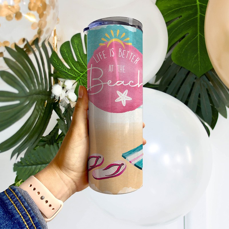- ✅ GREAT FOR GIFTING AND COLLECTING: I love my life, but I love it more at the beach! Featuring the phrase “Life is Better At The Beach” and a design of sandy beach with sunglasses, a towel and flip flops, this 20 oz tumbler with straw will be your new favorite accessory for your vacation.