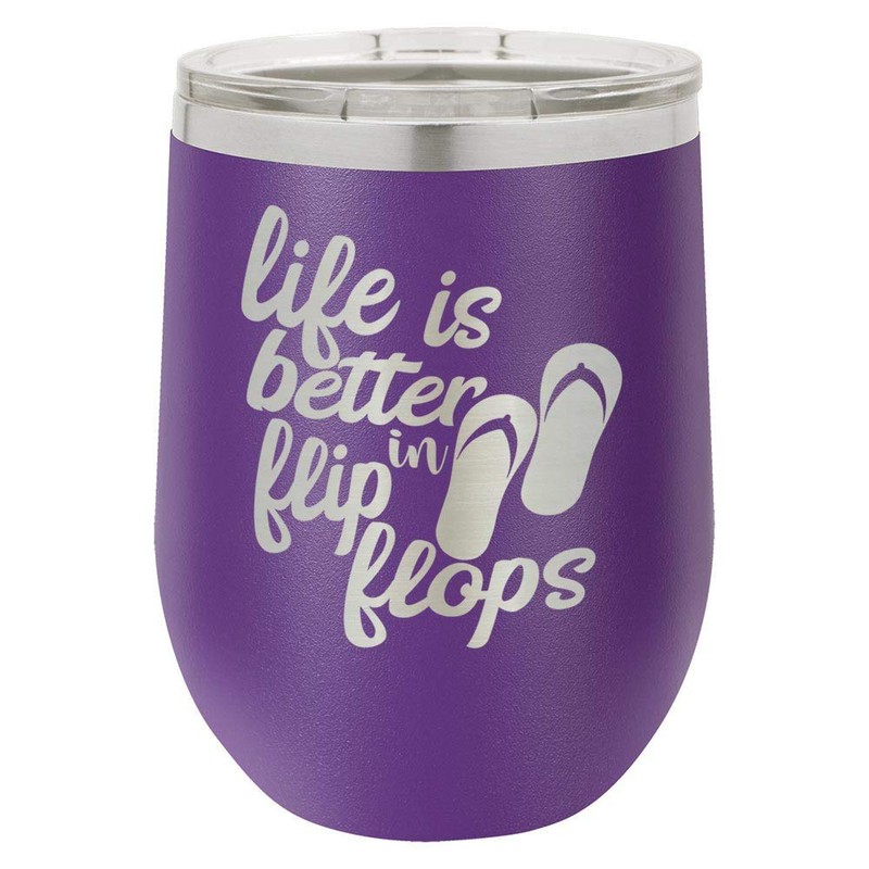 - ''' PREMIUM QUALITY ENGRAVED TUMBLER: This 12 oz Life Is Better In Flip Flops Engraved Wine Tumbler has a colored powder coating and our laser engraver removes this powder coating, exposing the high quality stainless steel and comes with a clear lid. THIS IS NOT A DECAL! Ideal for hot & cold beverages. A great gift for birthdays, Christmas, family occasions, vacations, beach, pool or travel.#||# SWEAT FREE DESIGN– No more coasters needed! - Better than plastic cups, plastic bottles, and glass, the double wall insulation and high quality slip-free powder coat does not sweat on the outside which allows you to conveniently keep a good grip on the tumbler while drinking on the go and at the same time keeping your hands dry!#||# BPA FREE & BUILT TO LAST – Polar Camel tumblers products are 100% BPA Free. Engineered with 18/8 kitchen and food grade stainless steel, our tumblers are durable, corrosion resistant and rust free and the lid is made from shatter resistant plastic! The slim 10 oz tumbler design will fit all car, vehicle, bike, and boat cup holders.#||# EXTREME TEMPERATURE RETENTION - This 12 oz Polar Camel tumbler's double-wall vacuum technology maximizes temperature retention that traps the cold in your beverages for 24 hours and the heat for up to 6 hours! No matter what the contents - hot tea, coffee, or an ice-cold beverage, the feel on this stainless vacuum tumbler remains constant!#||# SEE OUR OTHER GREAT GIFT IDEAS HERE ON AMAZON ~ BBQ BRANDING IRONS, ENGRAVED CUTTING BOARDS AND MORE: for Dad, Mom, Family, Friends Grandma, GiGi, Nana, Grammy, Grandpa, Gramps, Pop-Pop, Poppy, Papa, Paw Paw, Daddy, Pop, Pops, Pappy, Coach, Housewarming, Graduation, Christmas, Birthdayâ€s, Flasks, Engraved Tumblers, Travel Mugs and more! Click above on the OnlyGifts link to see our many great gift ideas!'''