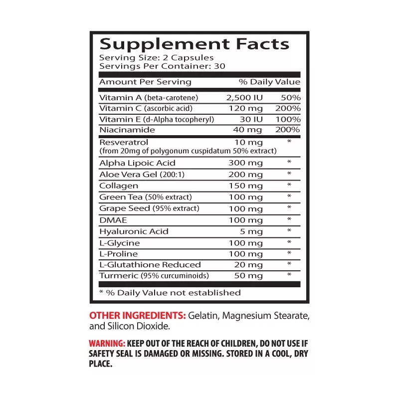 Aloe Vera, Grape Seed, Vitamin A, Vitamin C, Vitamin E, Resveratrol, Alpha Lipoic Acid, Collagen, Green Tea Leaf, Hyaluronic Acid, Glycine, L-Glutathione