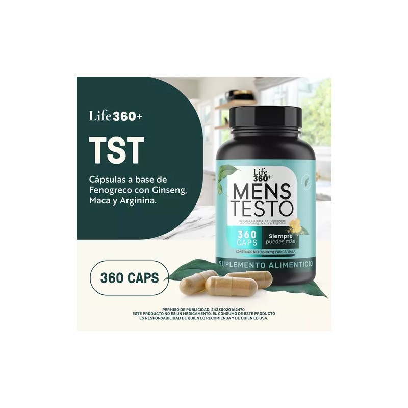 LIFE360+ Mens Testo un suplemento alimenticio que combina fenogreco, maca, L-arginina, ginseng, guaraná, vitaminas y minerales. Cada tarro contiene 360 cápsulas. ¡Descubre los descuentos y ofertas exclusivas que LIFE 360+ tiene disponibles para ti en Mercado Libre!