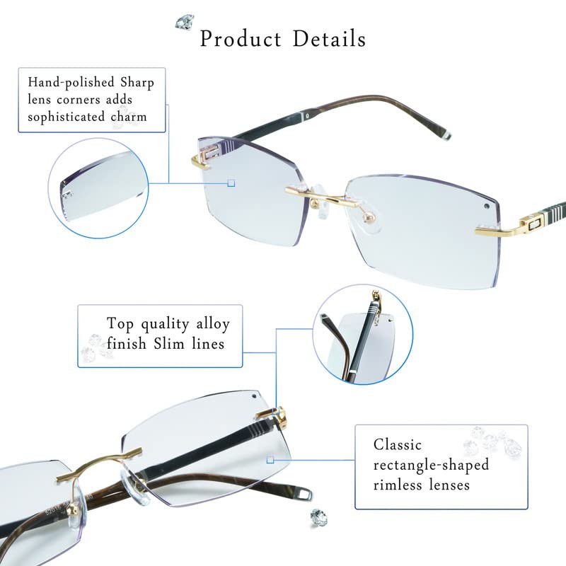 - Classic rimless frame design, ultra-lightweight, no pressure on your face and ears, durable with sturdy alloy frame.