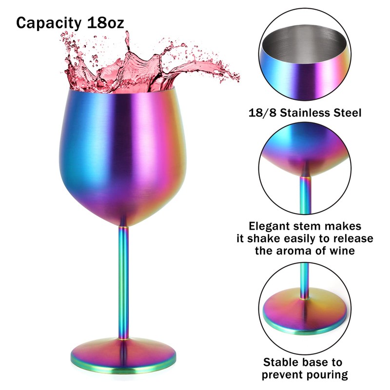 - Múltiples funcionales: las coloridas copas de vino de acero inoxidable con la capacidad de 18 onzas pueden satisfacer tus necesidades de muchas bebidas: vino, cóctel, champaña, jugo, refrescos, agua, y también son adecuadas para muchas ocasiones como fiestas, piscina, playa, picnic, camping, barbacoas, senderismo...