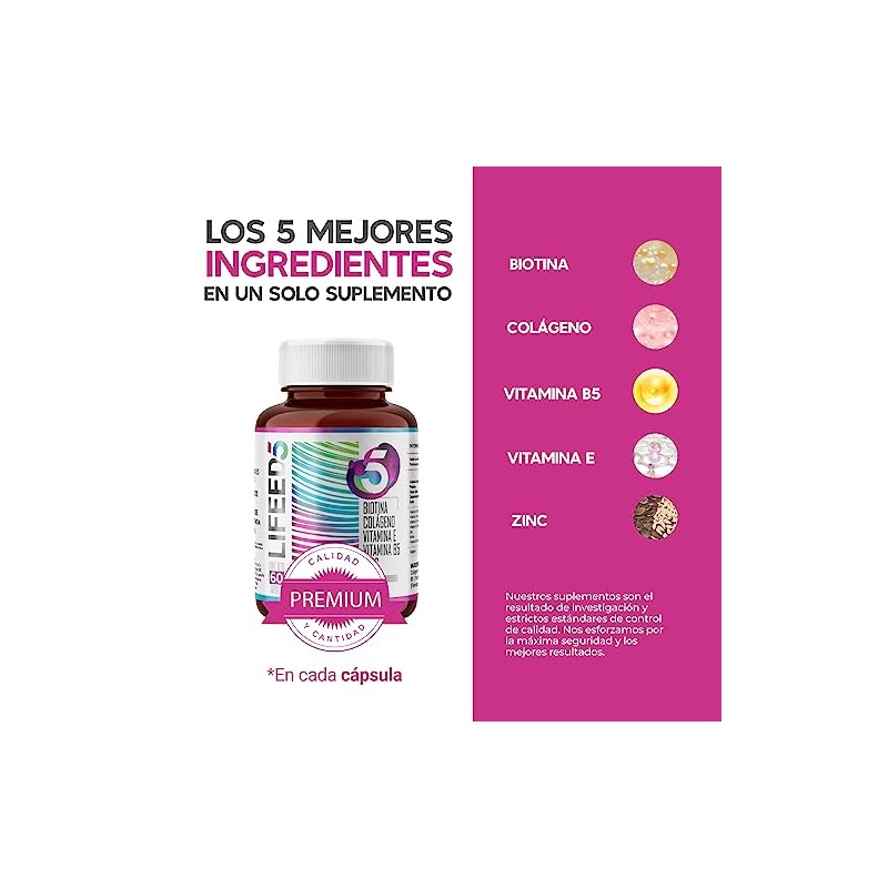 LIFEED Biotina, Colágeno Hidrolizado, Zinc y Vitaminas E y B5 | Multivitamínico Sin Gluten para Cuidado de Cabello, Piel y Uñas | Suplemento para Mujer y Hombre | Contiene 60 Cápsulas Tomar 1 al Día