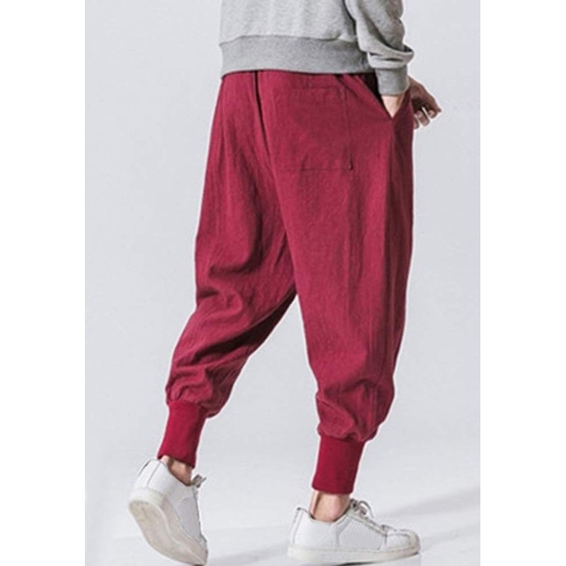 LifeHe Men Linen Drop Crotch Wide Leg Baggy Harem Pants (Red, XXL)