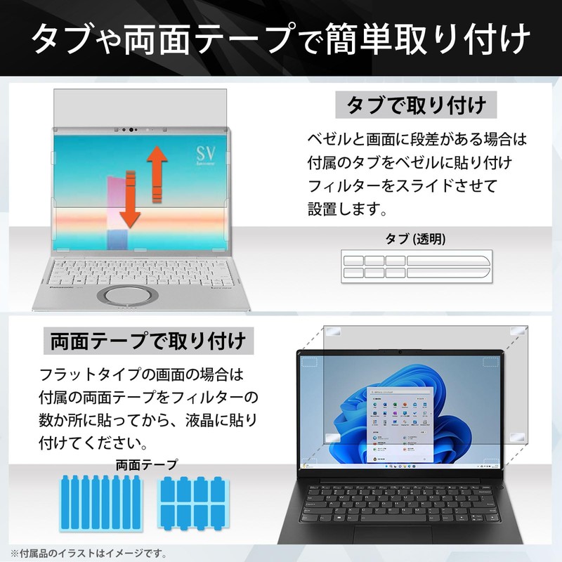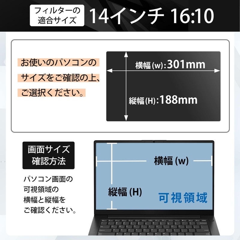 - (Prevents prying viewing) The screen is designed to appear black from an angle above 60° (30° left and right) to protect your privacy. Compatible Sizes: 14 inches (16:10); Product Dimensions: 11.8 inches (301 mm) x 7.4 inches (188 mm) *The size may vary depending on the model even with the same number of inches, so we recommend checking detailed measurements beforehand