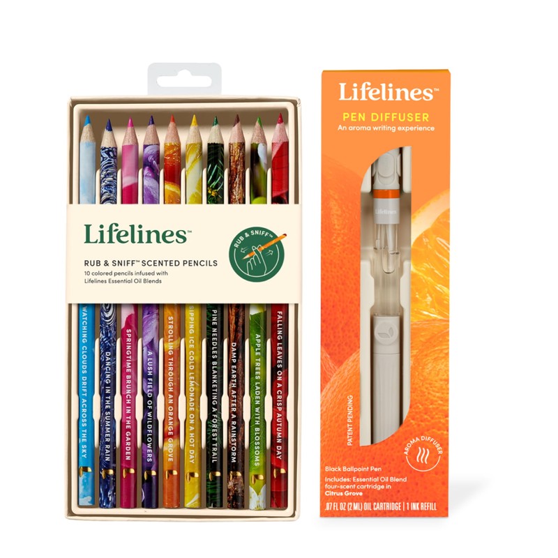 Lifelines Rub & Sniff Scented Colored Pencils & Citrus Grove Pen Diffuser Bundle, Infused with Essential Oil Blends, Set of 10 Pencils and 1 Pen with Ink Refill