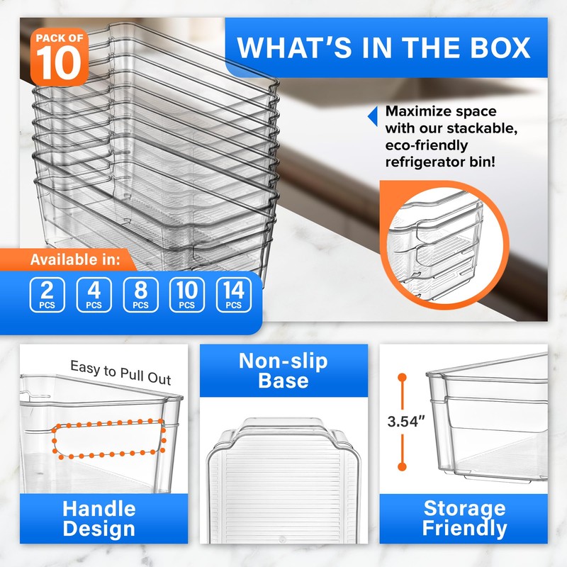 Lifemaster 10-Piece Stackable Refrigerator Bin Organizer Set with Easy Grip Handles - Clear Multi-Purpose Storage Bins for Fridge and Pantry Use