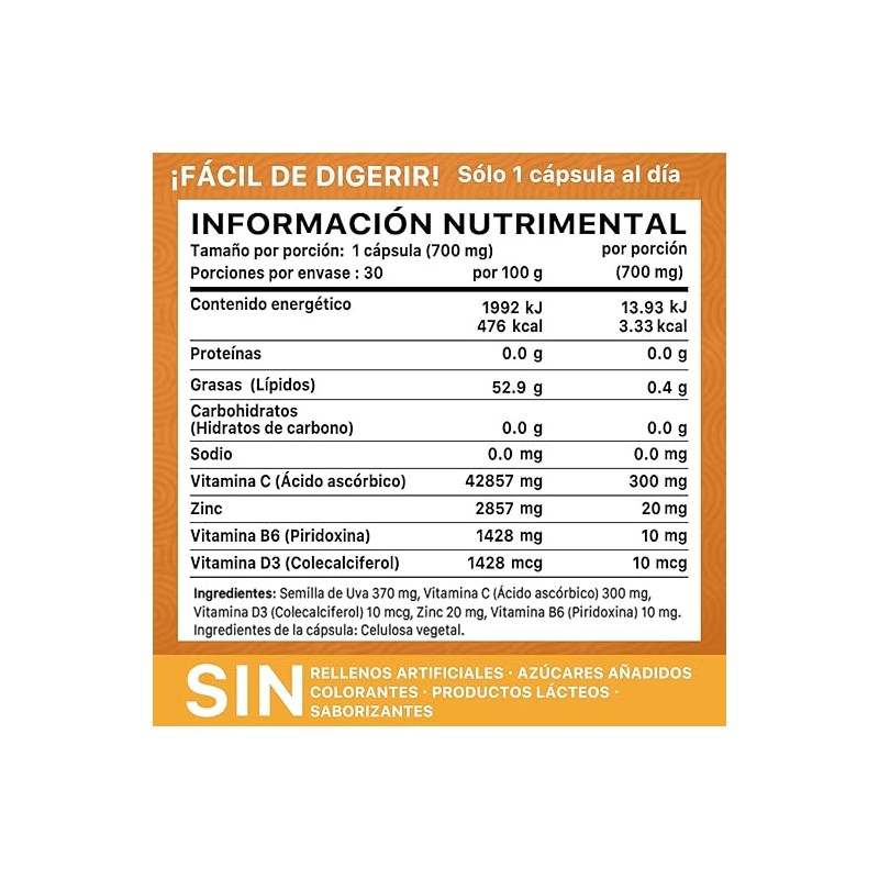 - SÓLO UNA CÁPSULA AL DÍA. Adicionado con semilla de uva y 300 mg de vitamina C por cápsula, además de vitamina D, zinc y vitamina B6.
