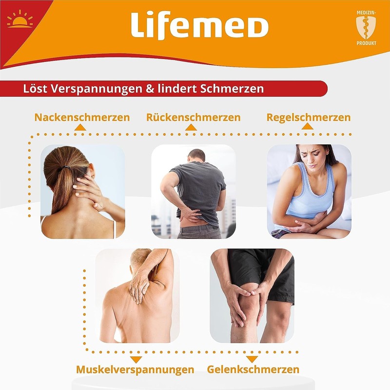 Lifemed Heat plaster without drug active ingredient for back pain, pain patches for back, shoulders and neck, heat cushion, neck warmer, heat belt and back saver - heat pad for on the go. Manufacturer of the product is INTCO MEDICAL. Notes: The adhesion of the plasters can be influenced by increased sweating, weather conditions, certain places of the body or individual skin conditions. When should I not use the plaster? Under the age of 12 years In case of a damaged patch In conjunction with lotions, gels, creams or ointments While sleeping. Instructions for use: For sufficient adhesion, the patch should be glued to dry skin. After opening, remove the protective film and attach the patch to the skin. Please note the instructions in the enclosed instructions for use. Our heat plasters are the perfect companion for a painful everyday life. For persistent pain, the heat patches can serve as a back support belt/back strap to relieve the back. The heat patch back/heat belt back can also be used as a neck warmer or heat patch neck, periods heat belt, for knee pain or as a shoulder warmer for shoulder pain.