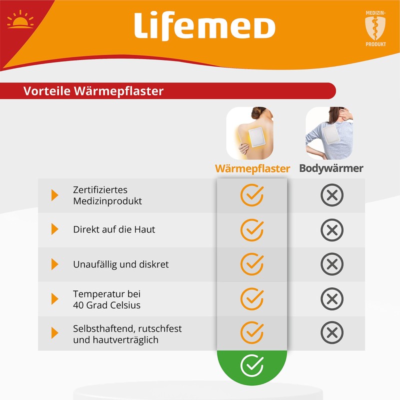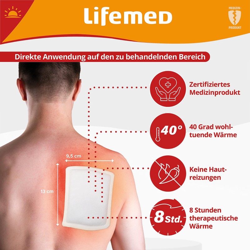 • Easy and direct: our self-adhesive, thin and odourless heat patch is a certified medical product that is applied directly to the skin - not on textiles.