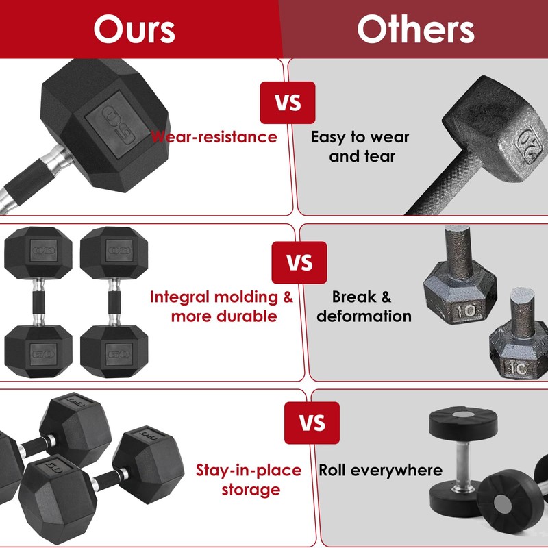 - SAFE AND COMFORTABLE: The rubber coating on the dumbbells also reduces wear and tear on the dumbbells and prevents damage to the floor. Ergonomic rubber textured handles help you hold the dumbbells without slipping. The hexagonal dumbbell design is not easy to roll on the floor and will not fall from the dumbbell rack, and the rubber coating on the dumbbells reduces noise and can also effectively avoid rust problems.
