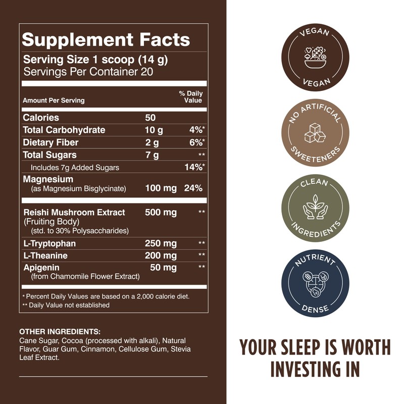 - Soothing Sleep Drink Mix: Indulge in a rich, cinnamon-cocoa powder with Magnesium, L-Theanine, and L-Tryptophan to promote a calm mind, deep sleep, and restful recovery after a long day. Sip and enjoy as you unwind and relax before bed.