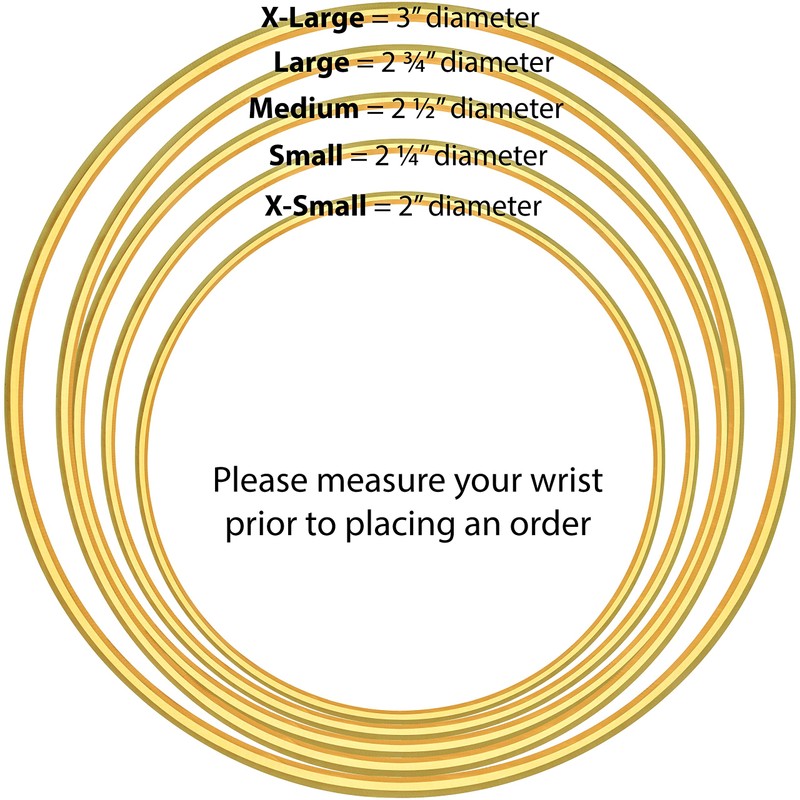 - Available in 5 sizes: X-Small = 2 inches in diameter, Small = 2 1/4 inches, Medium = 2 1/2 inches, Large = 2 3/4 inches and X-Large = 3 inches; Please measure your wrist prior to placing an order; Sizing photo is available for your reference