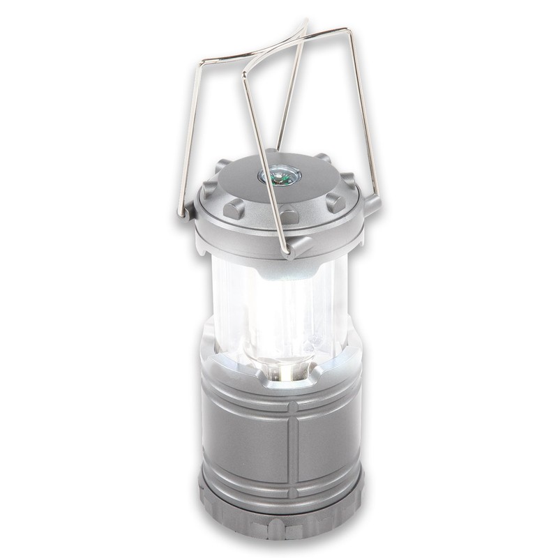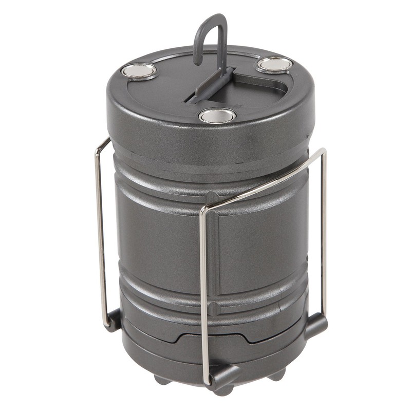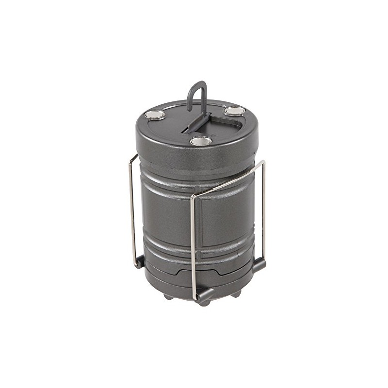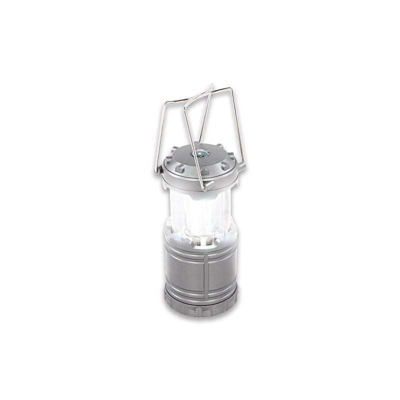 Just pop open this compact dynamo and watch the ultrabright white COB LED lighting illuminate the dark unlike ordinary lanterns Unique strip lighting can be seen over 2 miles away, making it great for emergencies, camping or night walks. When you are done, simply close it and it suddenly is no bigger than a soda can. Watertight submergible design made to withstand extreme freezing heat temperatures. Foldaway handles for handsfree use. Collapses to 4 3/4" tall, opening to 7". Requires 3 AA batteries.