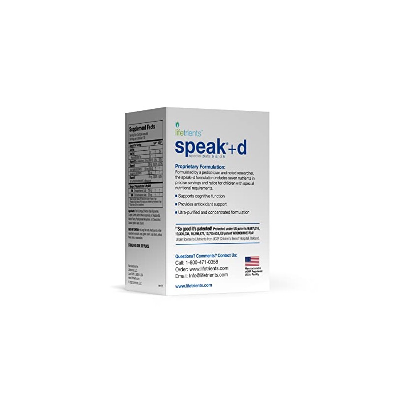 - Speak+d Twist-Off Softgels include precise serving ratios of seven nutrients to support children with special nutritional requirements