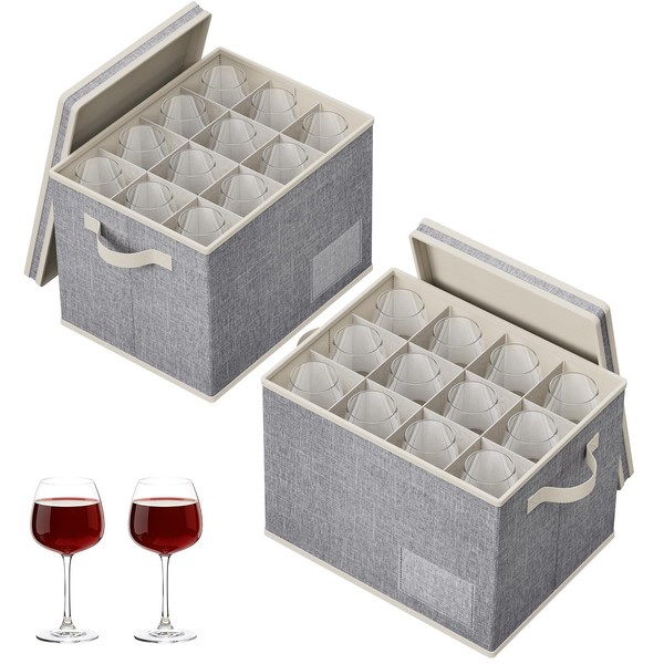 Lifewit 2 Pcs Wine Glass Storage Box with Dividers, Stackable Cationic Hard Shell Stemware Organizer Case 24 Cells, Foldable Dustproof Crystal Goblets Containers for Drinkware Moving, Light Grey