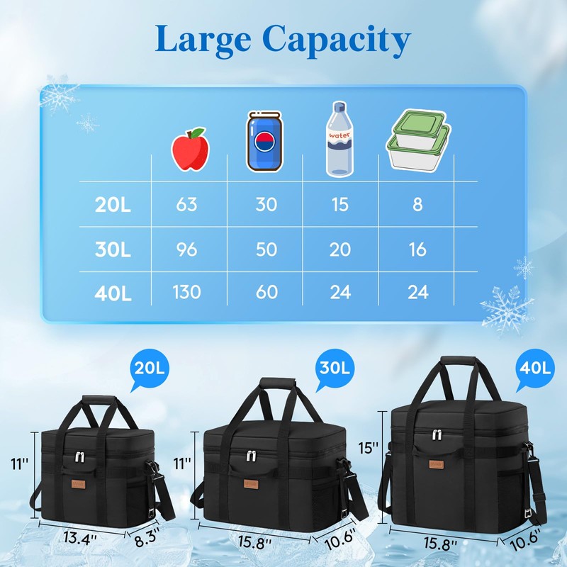• Large Capacity: Available in 20L/30L/40L sizes, this cooler bag can hold up to 30, 48, and 72 cans of 330 ml, offering enough space for all beverages and snacks; The 20L version measures 13.4"(34 cm)×8.3"(21 cm)×11"(28 cm), it can be folded into cabinet drawer to save space