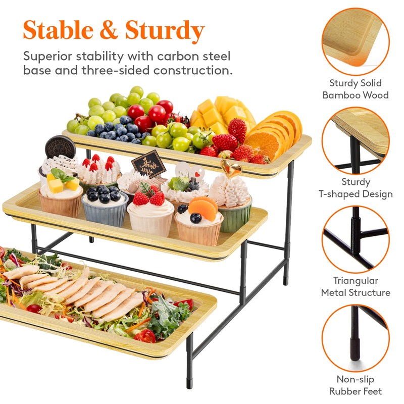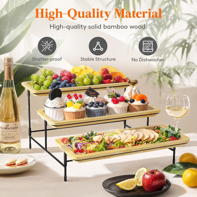 • Space-Saving: This three-tier tiered serving tray maximizes vertical space with its three-layer design, adding height to your food display. It efficiently utilizes limited tabletop space while presenting food in an organized and attractive manner. When not in use, the trays can be stacked for easy storage