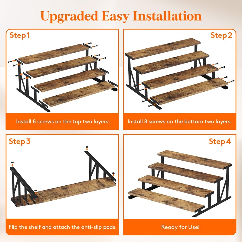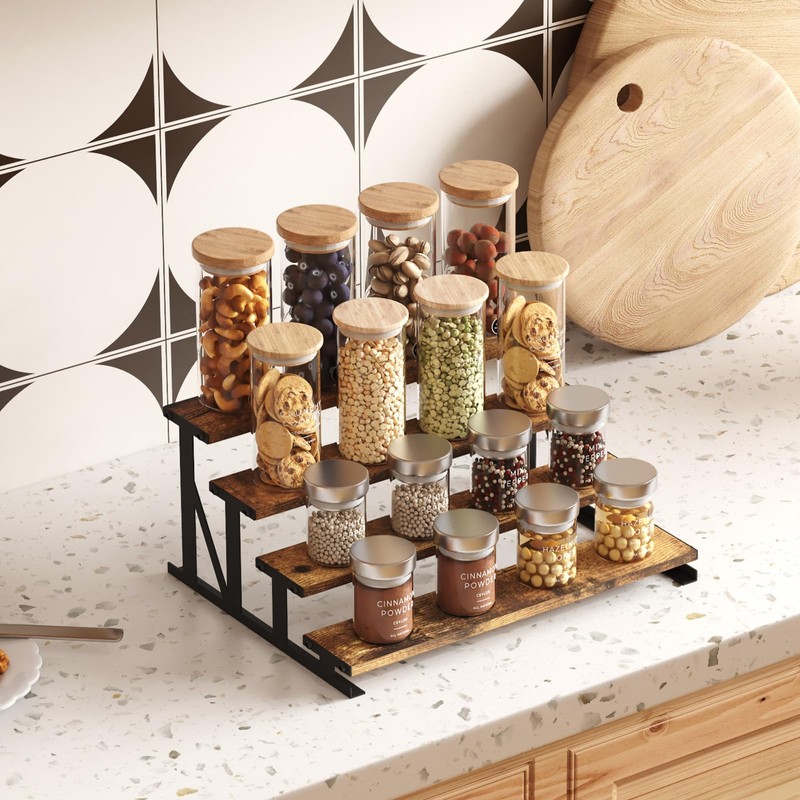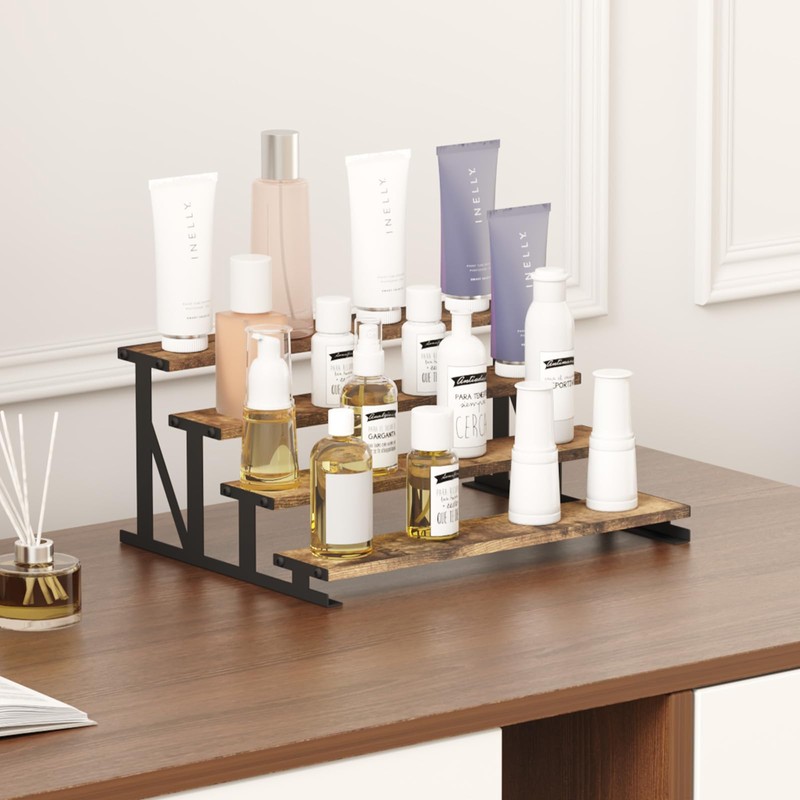 Lifewit 4-Tier Wooden Dispaly Riser with Metal Stand, Step Cologne Stand, Perfume Organizer, Display Shelf for Fragrance, Skincare, Figurine, Spice, Use for Tabletop, Cabinet, 1 Set, Rustic Brown