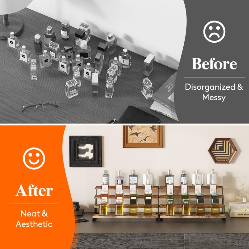 - Wooden Style: This wooden cologne organizer for men has a rustic wood grain that complements the black metal rack, adding elegance to your perfume storage; The step design maximizes vertical space, with varying layer heights that highlight your displays