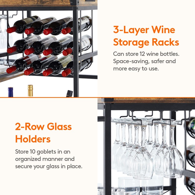 - Large Storage Space: Measuring 31.5" X 15.7" X 36.6" (80 x 40 x 93 cm), this drink cart comes with 3 open shelves, 12 bottle racks and 10 glass holders for storing wines, beverages, snacks, ice buckets, glasses and all the other happy hour essentials. Perfect height for easy access.