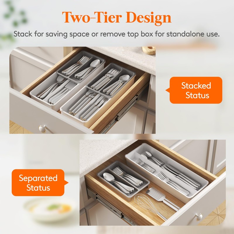 - Two-Tier Design: Featuring a unique two-tier design with four compartments, this cutlery drawer organizer allows you to stack them to maximize drawer space or remove the top box for standalone use