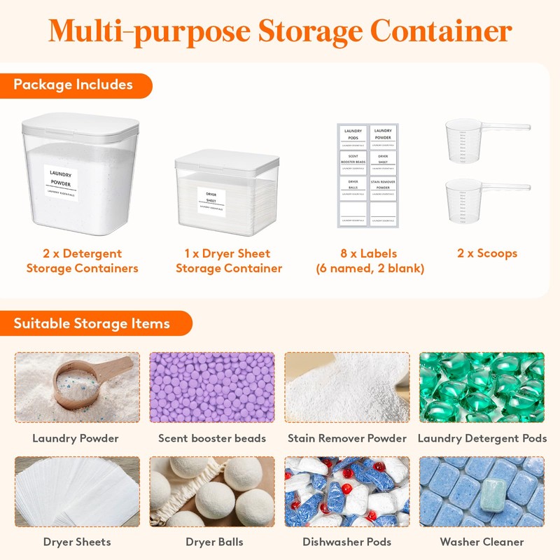 • Package Includes: 2 x laundry powder container, 1 x dryer sheet holder, 8 x labels (6 with names, 2 blank), and 2 measuring scoops; elevate your laundry experience with this storage solution