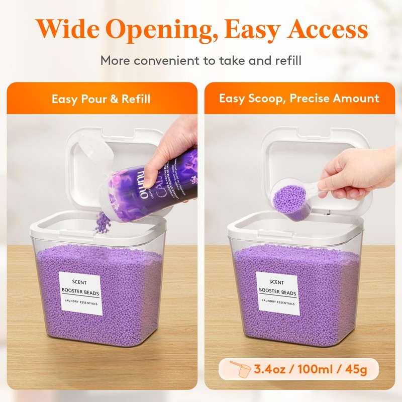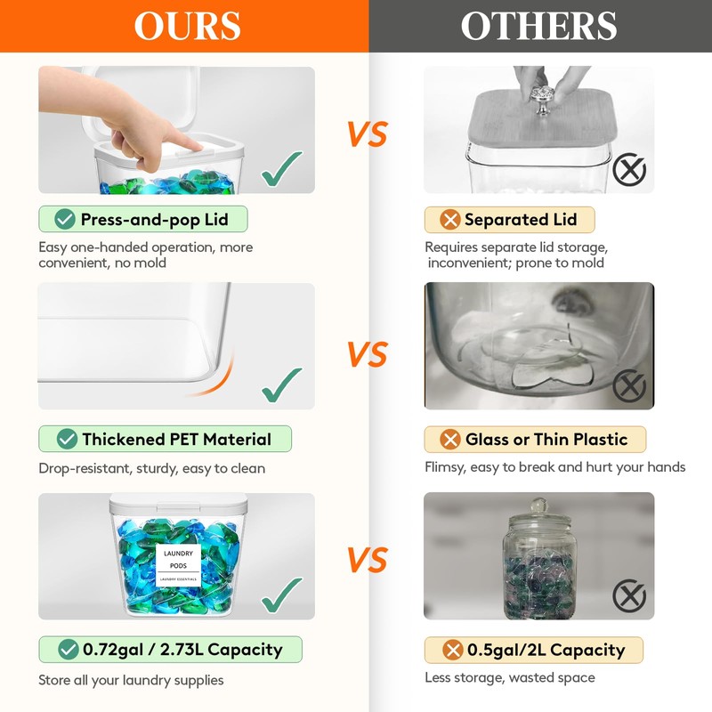 • Easy One Handed Access: These laundry powder containers have press-and-pop lids for effortless one-handed opening or closing; the wide opening makes them easy to scoop out or refill laundry detergent and pods; enjoy an tidy and efficient laundry experience with ease