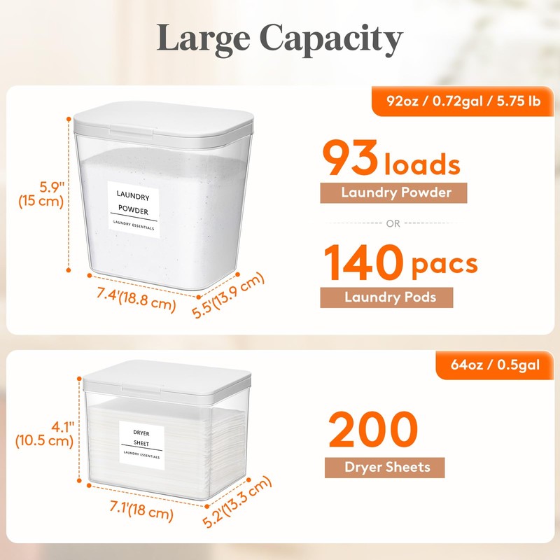 • Large Capacity: The laundry pods container holds 0.72 gal (92 oz / 2.7 L) and measures 7.45.55.9 in (18.813.915 cm); the dryer sheet holder holds 0.5gal (64oz / 1.9 L) and measures 7.15.24.1 in (1813.310.5 cm); they can store a variety of laundry essentials, such as laundry powder, aundry pods(54 pacs for triple-chamber/140 pacs for single-chamber), scent booster beads, dryer balls, 200 dryer sheets, and more