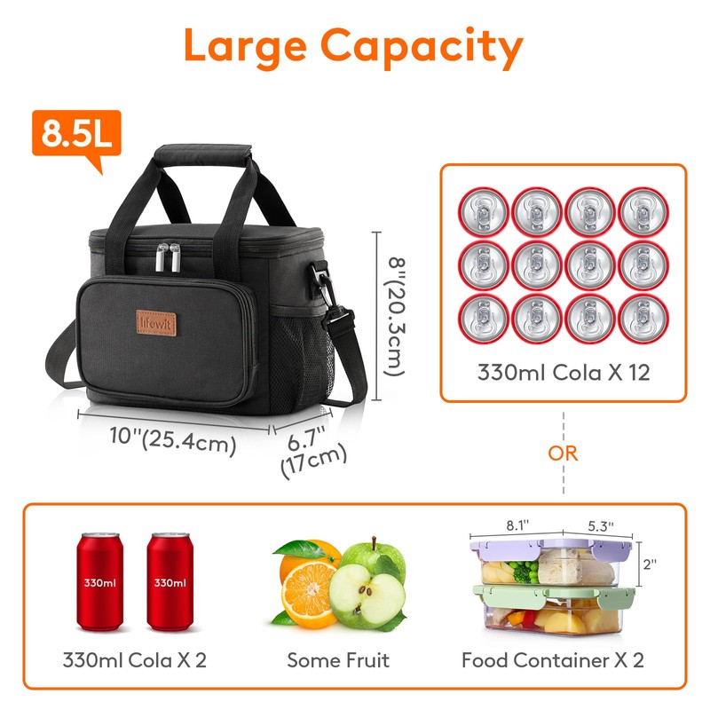 - Large Capacity: Dimensions - 10"(25.4cm) 6.7"(17cm) 8"(20.3cm). The maximum capacity of lunchbox for adults is 8.5L, and is spacious enough to store 12 cans of coke (330ml), or your lunch such as sandwiches, salad, snacks, drinks and fruits and so on. It is suitable for office, for work, picnic, beach, trip